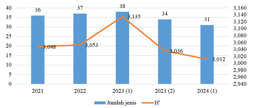 Perbandingan jumlah jenis dan nilai H’ tahun 2021-2024