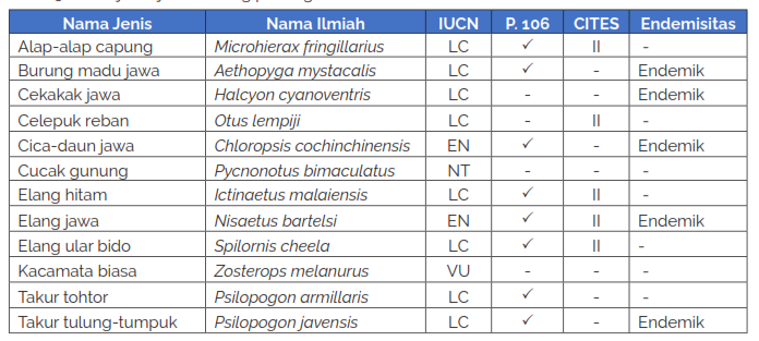 Burung di kawasan IPJLPB PT PLN IP Unit PLTP Gunung Salak mempunyai peranan penting terhadap keberlanjutan ekosistem, namun beberapa jenis burung memiliki kerentanan terhadap kepunahan karena kelimpahannya yang rendah maupun endemisitasnya yang tinggi. Keberadaan satwa tersebut sangat penting untuk dilestarikan dengan berbagai upaya untuk mempertahankan keberadaannya. Berdasarkan daftar Appendix CITES, dua jenis burung yaitu elang hitam (Ictinaetus malaiensis) dan elang jawa (Nisaetus bartelsi) termasuk dalam kategori Appendix II CITES, yang berarti spesies ini tidak terancam kepunahan, tetapi mungkin terancam punah bila perdagangan terus berlanjut tanpa adanya pengaturan.